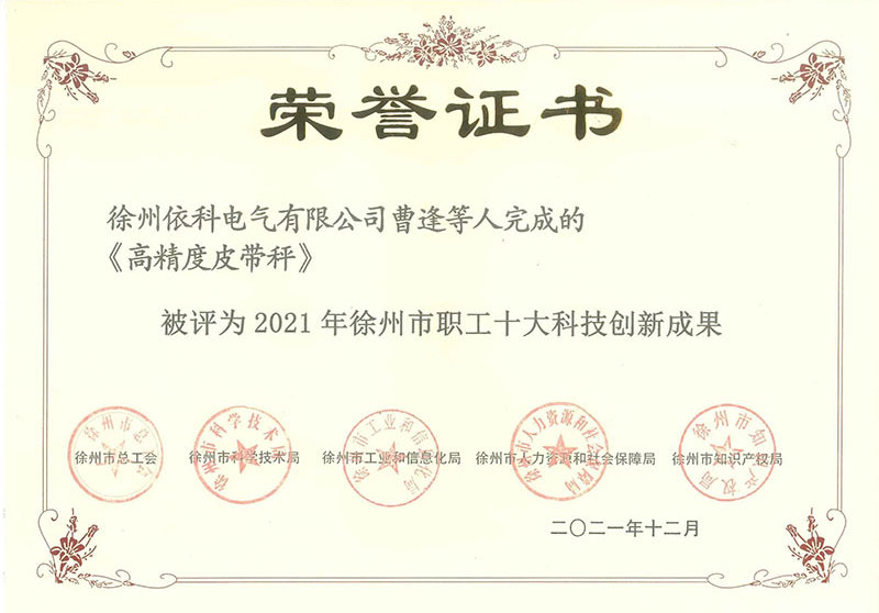 依科高精度皮帶秤被評為徐州職工十大科技創(chuàng)新成果