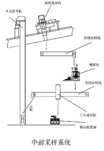 圖片展示了一種典型的中部兩級(jí)采制樣系統(tǒng)。該系統(tǒng)由旋斗式中部采樣機(jī)、初級(jí)樣品給料機(jī)、錘式破碎機(jī)、次級(jí)樣品給料機(jī)、二次采樣機(jī)和余料處理設(shè)備等組成。