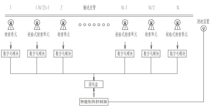 1、皮帶發(fā)生跑偏及料流發(fā)生變化,傳感器會受到水平側(cè)向力及物料偏載的影響傳感器受力,所以導致輸出精度誤差。傳統(tǒng)皮帶秤的重量信號采集一般是1-4只傳感器即2-4組托輥,這么短的測量距離不能有效反應皮帶的運行狀態(tài)無法進行精確計量物料重量,無法進行多組數(shù)據(jù)比對、無法進行數(shù)學模型修正。而我們的矩陣式皮帶秤有四~十六組模塊化秤體之間可以相互校驗相互冗余,矩陣模塊化秤體均可采用電動自動掛碼校驗,無需人工。模塊化秤體之間的可以按序列間隔使用,配合智能矩陣控制稱重儀表將之分為系統(tǒng)內(nèi)雙套秤。八~十六組模塊化秤體中的其中n/2+1組(高序號)安裝電動起降裝置,實現(xiàn)系統(tǒng)內(nèi)雙秤在線校驗,自動修正系統(tǒng)精度,實現(xiàn)自我判斷精度狀態(tài),自我修正。